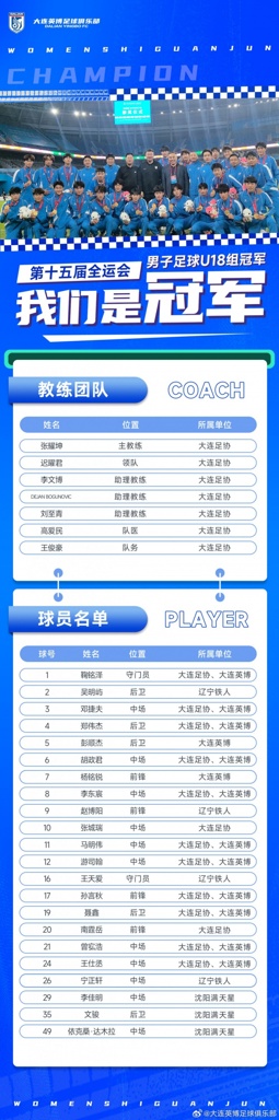 再次祝贺你们夺得全运会冠军!祝愿辽宁足球青训事业蒸蒸日上,再续辉煌!